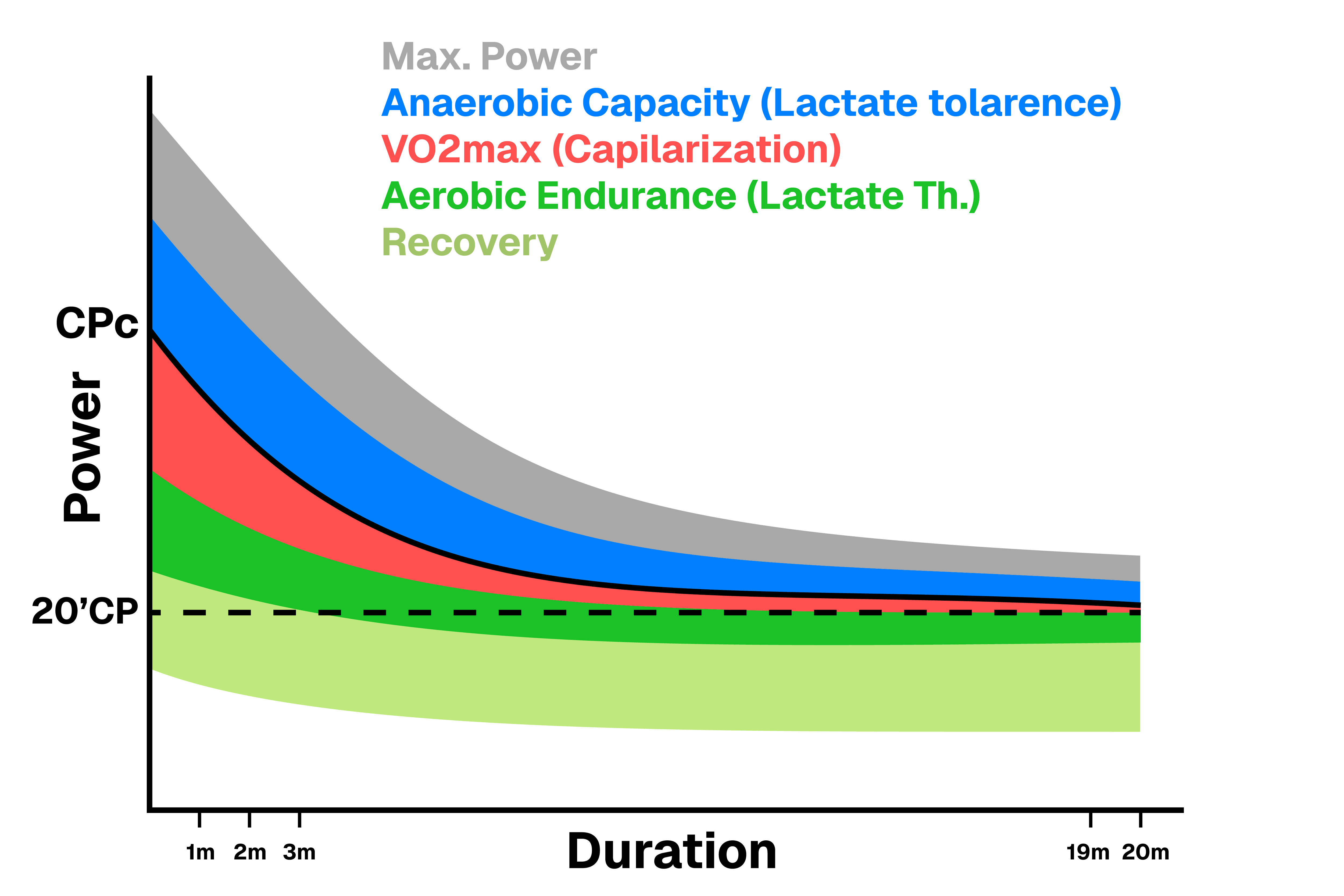 Defining the CPc makes it possible to move beyond static training zones based on a single value, and instead use ability-improvement zones that run parallel to the CPc — giving you a complete picture of your ability improvement boundaries across every duration.