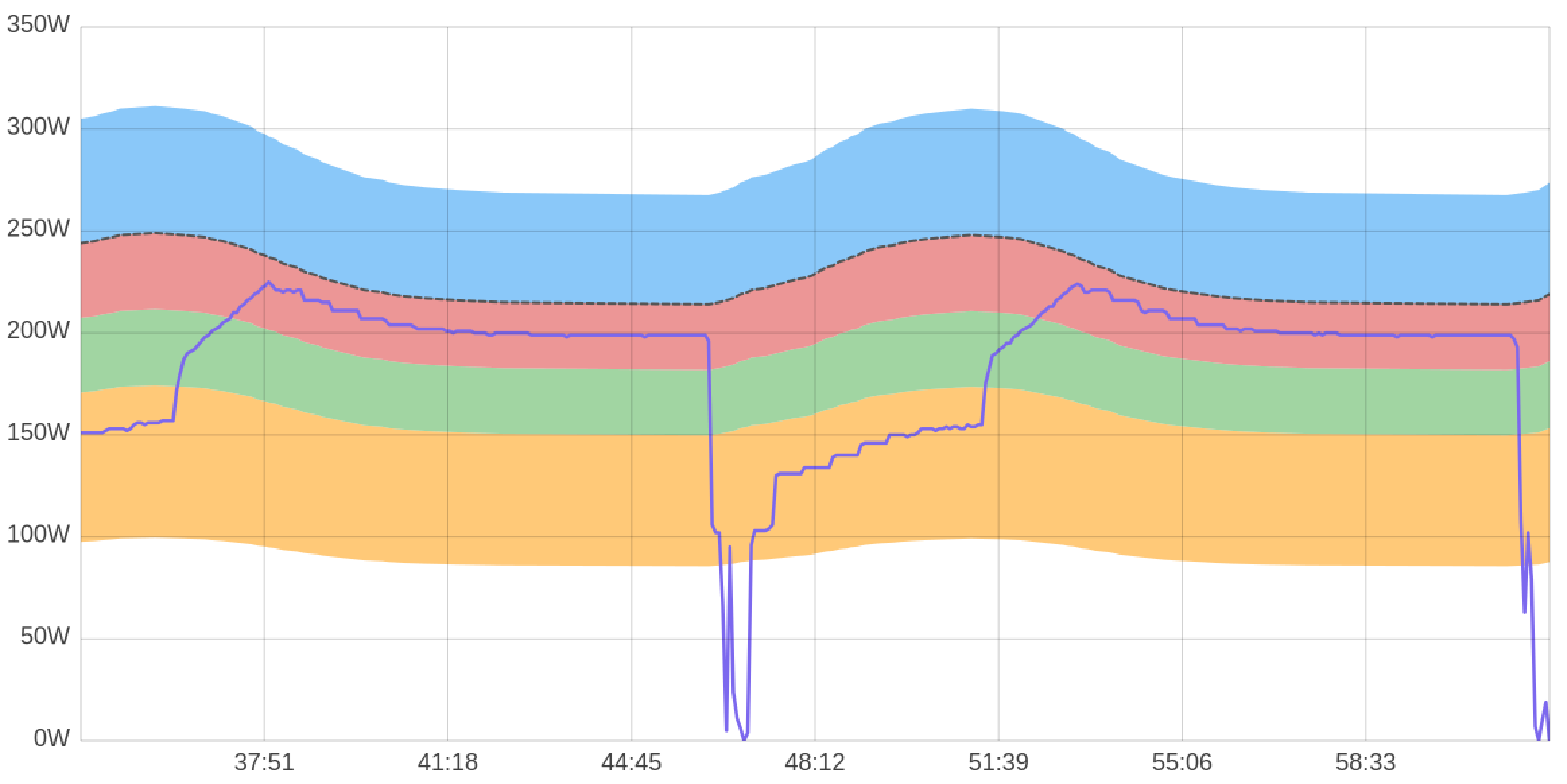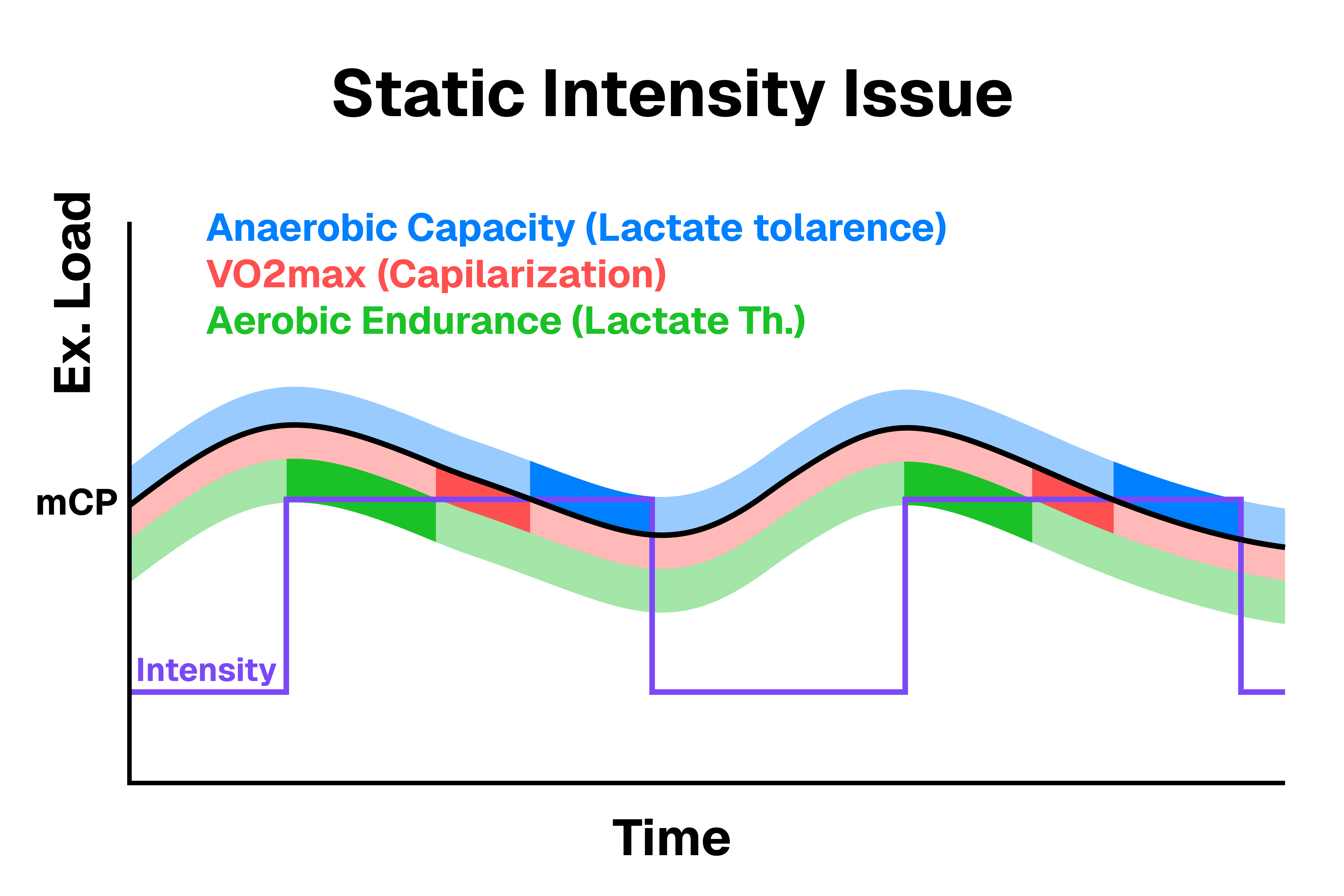 At a static load, intervals gradually feel harder over time — because fatigue is shifting your zone boundaries. As it builds, a constant intensity drifts across multiple zones, and only a fraction of the interval is spent in the actual target zone.