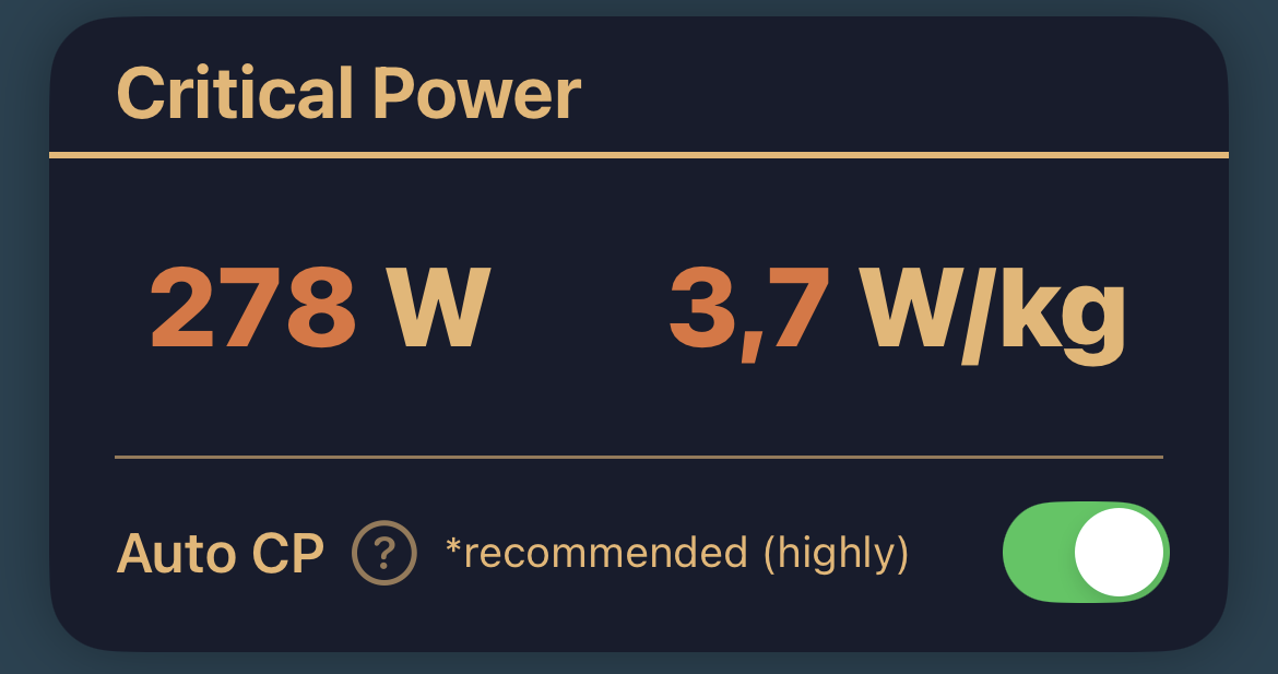 Displays your 20’ CP in watts and watts per kilogram (W/kg).